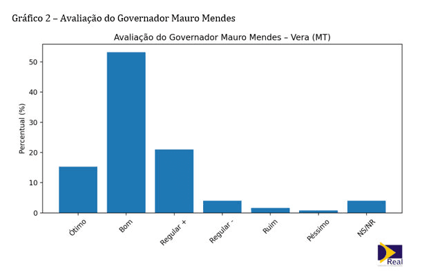 O governador Mauro Mendes apresenta avaliação majoritariamente positiva em Vera, com 68,5% de ótimo ou bom e apenas 2,4% de ruim ou péssimo, indicando alinhamento político e administrativo percebido pela população.